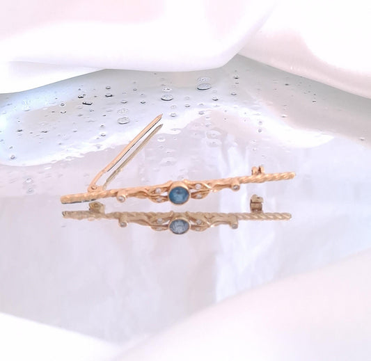 Alfinete de peito trabalhado a ouro e prata com pedra verde ao centro pérolas e rosinhas