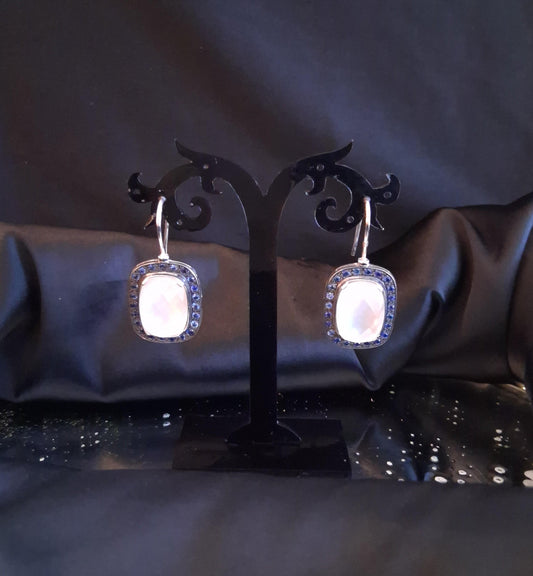Brincos ouro branco e prata com pedras azuis e branca